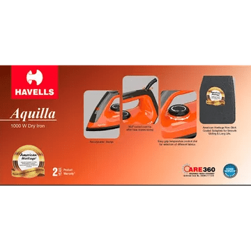 HAVELLS Aquilla 1000 Watts Dry Iron (Shock Proof Body, Amber)